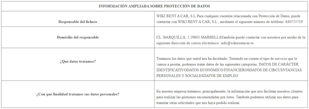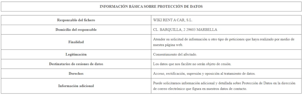 A efectos de lo dispuesto en el Reglamento Europeo de Protección de Datos, WIKI RENT A CAR, S.L., le informa que en determinadas áreas de nuestra Web se solicita al usuario una serie de datos de carácter personal.
